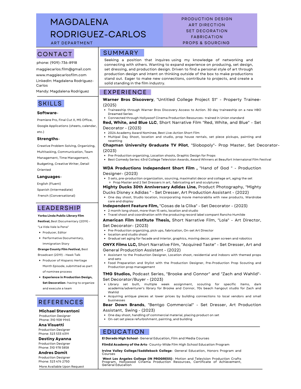 Creating, building, and overseeing the spaces needed to bring a story to life is the most exciting role to be in. With the efficient use of community and resources, I make sure to bring a unique look and honor the setting, time period, and subjects the project is based on.